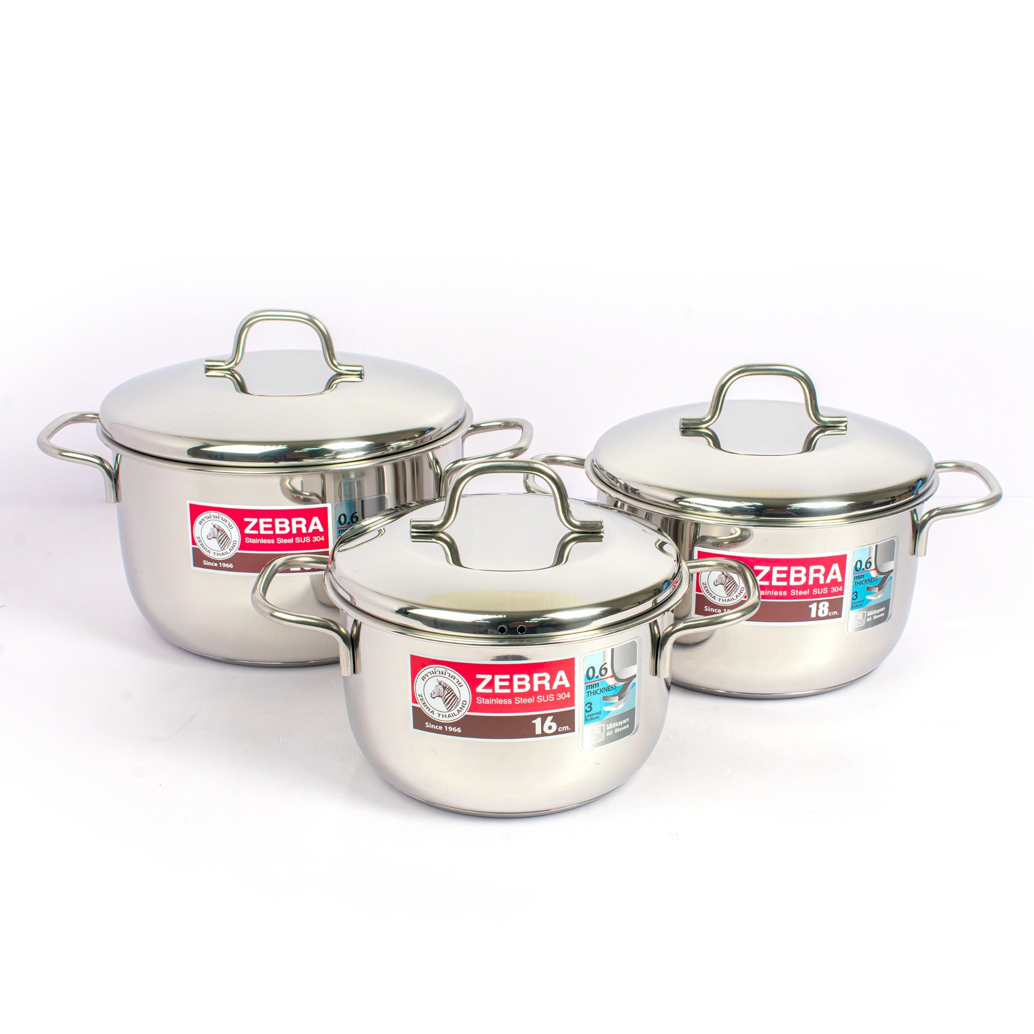 Bộ 3 nồi inox 304 Zebra Thái Lan nắp vòm sử dụng được trên tất cả các loại bếp (bếp từ, bếp điện, bếp Ceramic, bếp Gas)